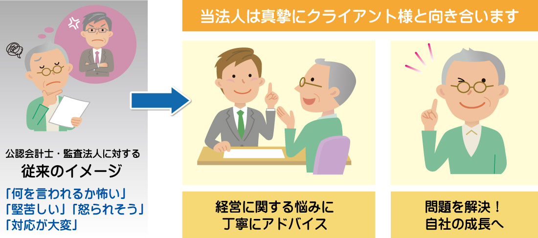 当監査法人に所属する公認会計士は、独立第三者の立場を堅持しつつも、真摯にクライアント様と向き合いながら、問題提起等をすることにより指導的機能を発揮して監査を進めていきます。